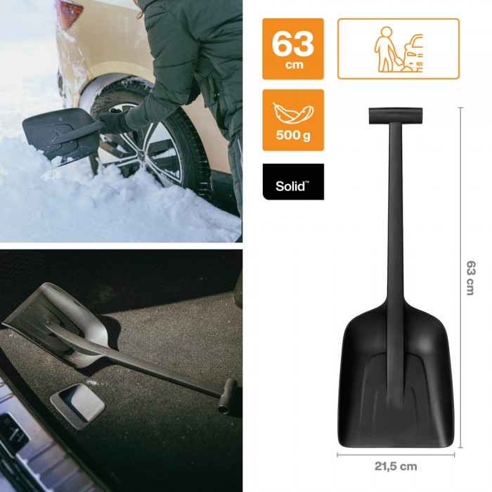 Fiskars Solid™ 1019353 — компактная автолопатка из цельнолитого FiberComp™ (стекловолоконный композит) с Т-образной рукоятью. Размеры 220 × 630 × 105 мм, масса ≈500 г — удобно хранить в багажнике и быстро очищать снег у колёс.
