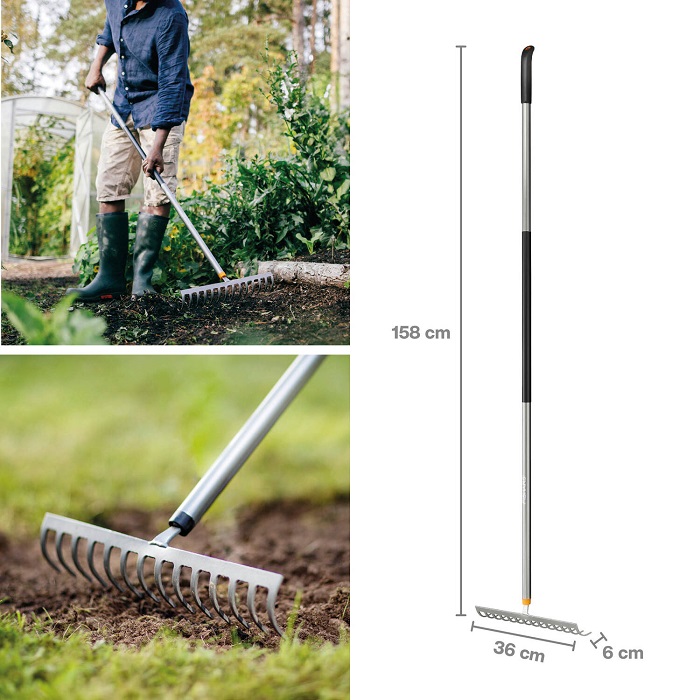 Fiskars Ergonomic™ Soil Rake 36 см с алюминиевой ручкой 150 см (1077113) — это универсальные грабли для подготовки грядок: выравнивания почвы, разгребания мелких веток и равномерного распределения мульчи. Длинная алюминиевая рукоятка с каплевидным профилем (teardrop) и пластиковым покрытием обеспечивает удобный, нескользкий хват. Есть петля для подвеса.