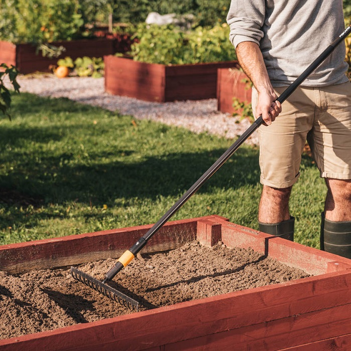 Fiskars QuikFit™ Soil Rake, 16 prongs, 40 см (1000654) — это почвенные грабли для сгребания, выравнивания и разравнивания посевных гряд на большой площади; 16 зубьев из закалённой углеродистой стали.