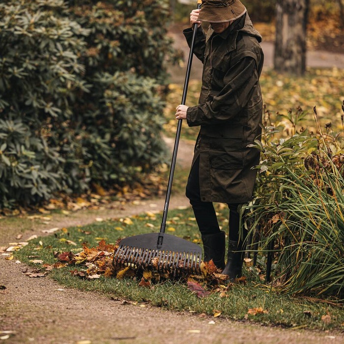 Газоны, двор, террасы, садовые дорожки — сухая уборка листвы, хвои и лёгких садовых остатков.