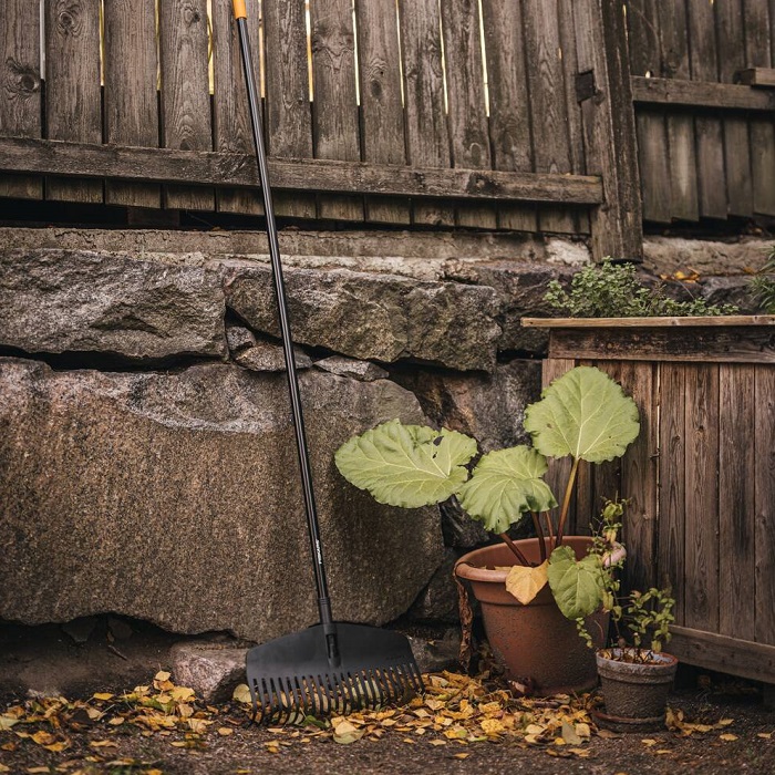 Gardena 03101-20 (43 см, combisystem): близкая ширина, однако Fiskars 42 см манёвреннее в стеснённых местах; пластик у обеих эластичный и износостойкий, у Fiskars изогнутая форма зубьев лучше противодействует накоплению мусора.