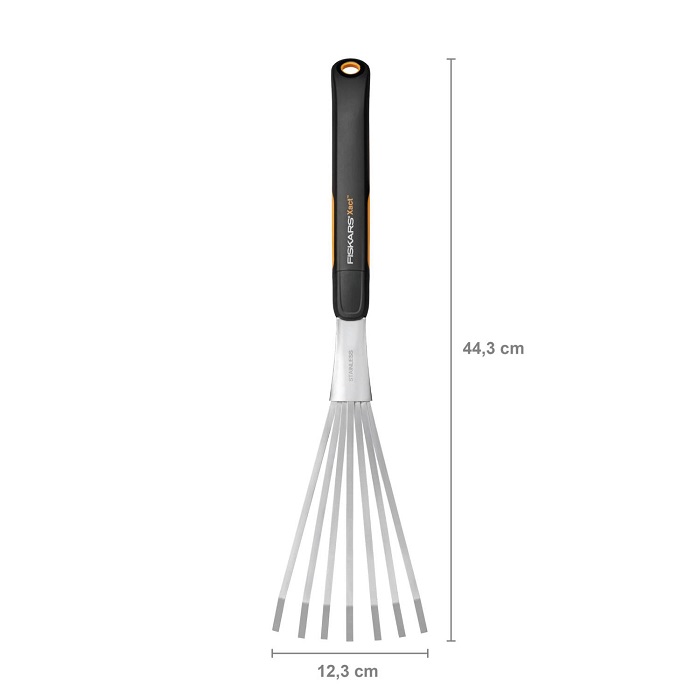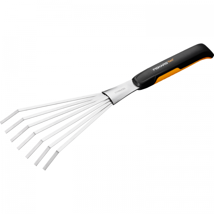 Fiskars Xact™ Hand Rake (1027044) — компактные веерные грабельки для уборки листьев, травяной крошки и мусора на небольших клумбах и в труднодоступных местах. Точно обработанная нержавеющая головка с 7 зубьями обеспечивает контроль, а удлинённая рукоятка SoftGrip™ даёт удобные хваты, баланс и дополнительный рычаг.