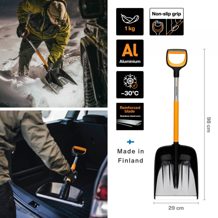 Компактная авто-лопата для багажника. Ширина ковша 29 см, длина 98 см, вес ≈1,0 кг. Усиленная кромка со стальным (нерж.) сердечником — служит до 3× дольше, алюминиевая штанга, D-рукоять SoftGrip™ с нескользящим хватом. Мороз до −30 °C. Сделано в Финляндии.