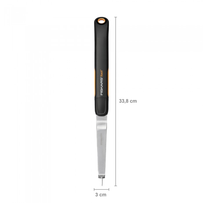 Fiskars Xact™ Small Weeding Knife (1027045) — компактный двулезвий нож для удаления сорняков и мха между тротуарными плитами и на террасах. Точно обработанные нержавеющие лезвия дают отличный контроль и чистый срез, а удлинённая рукоятка SoftGrip™ обеспечивает удобные хваты и дополнительный рычаг. Есть отверстие для подвеса.