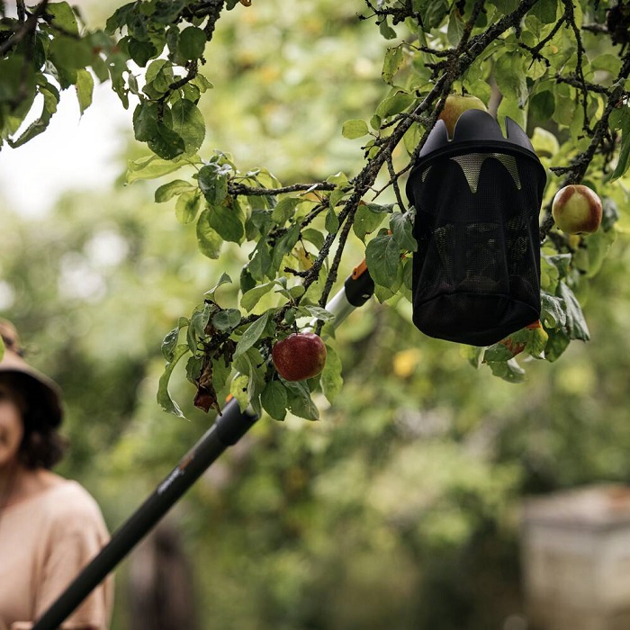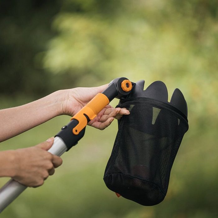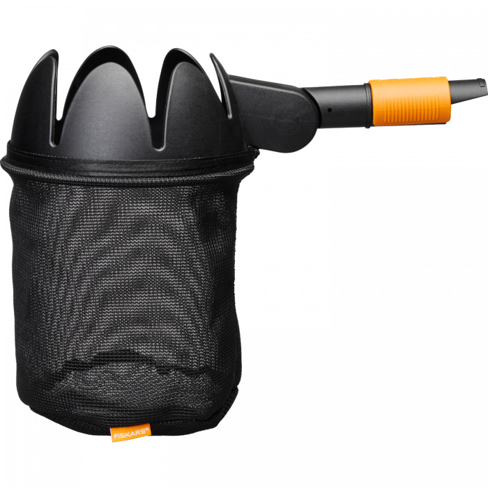 Сборщик фруктов Fiskars QuikFit™ (1000693) — насадка для бережного снятия плодов с веток. Широкое отверстие и направляющие «пальцы» помогают быстро зайти на фрукт и направить его в мягкий сетчатый мешок. Корпус из FiberComp™ лёгкий и прочный; съёмный мешок можно стирать в машине, а через сетку видно урожай во время работы.