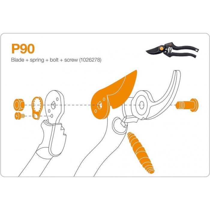 Blade, Spring, Bolt, Screw (P90) (1026278) это — оригинальный ремкомплект для профессионального секатора Fiskars Pro Pruner P90 (1001530). В наборе всё, чтобы вернуть инструмент к «заводскому» резу и плавному ходу.
