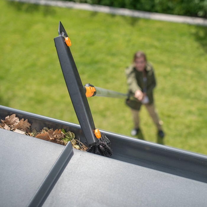 2-в-1: щётка + скребок — полный цикл очистки желоба одним инструментом.