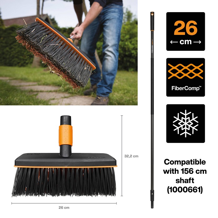 Дворовая щётка Fiskars QuikFit™ Yard Broom 26 см (1001417) — универсальная насадка системы QuikFit™ для ежедневной уборки на улице и террасах. PowerClean™ сочетает мягкую и жёсткую щетину в одной головке: бережно собирает пыль и уверенно подхватывает листья, песок, мелкий гравий.