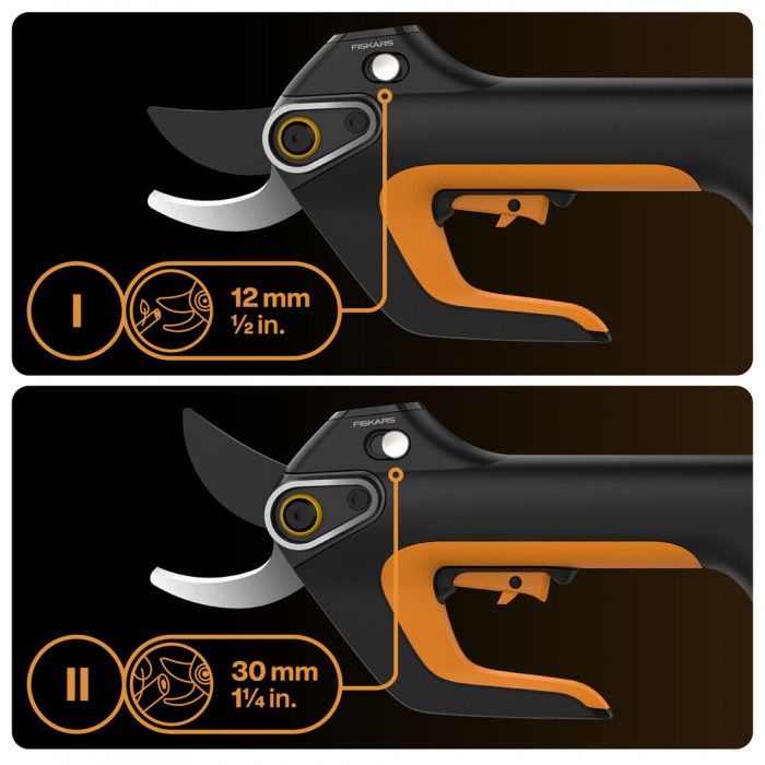 2-в-1 перемикач режимів: для тонших і товстіших гілок — швидше працювати на дрібних пагонах і впевненіше на товстіших.