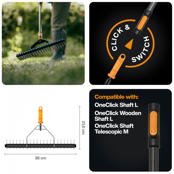 Основні характеристики Граблі-аератор фрезеруючі для вичісування газонів Fiskars OneClick 36 см (1080679)