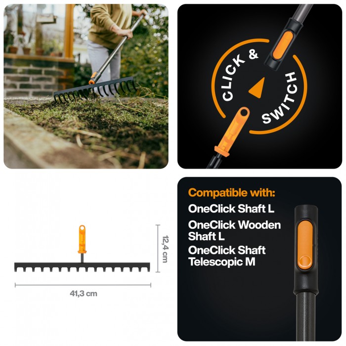 Fiskars Soil Rake 16 prongs OneClick (1080678) це - граблі-насадка на 16 зубців для загрібання, вирівнювання та фінішного розгладження ґрунту на посівних площах і грядках. Загартовані зубці зі вуглецевої сталі забезпечують стабільну роботу по ґрунту, а система OneClick автоматично фіксує насадку на держаку.