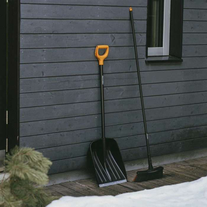 Fiskars Solid™ Snow Shovel 35 см (1052525) це — легка та міцна лопата для швидкого прибирання снігу у дворі, на доріжках і біля гаража. Відвал із морозостійкого пластику працює тихо по бруківці та плитці, а довга алюмінієва ручка дає хороший важіль і менше втомлює під час тривалого прибирання.