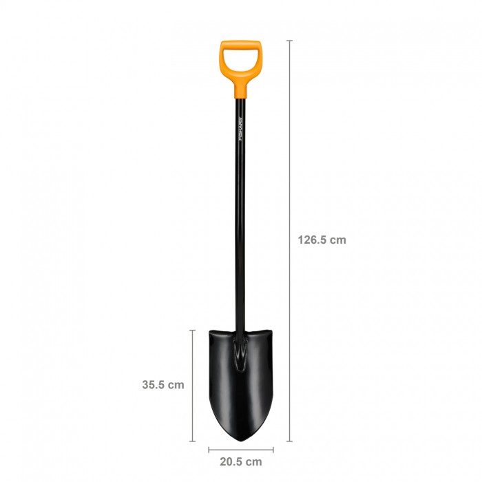 Fiskars Solid™+ Spade XL Blade Long Shaft, 127 см (1067517) — міцна штикова лопата з видовженим держаком для важких ґрунтів (глина, камінь). Довге та злегка вигнуте древко дає кращий важіль і зручну робочу позу для високих користувачів.