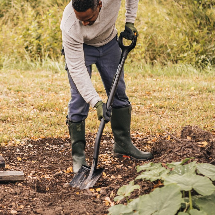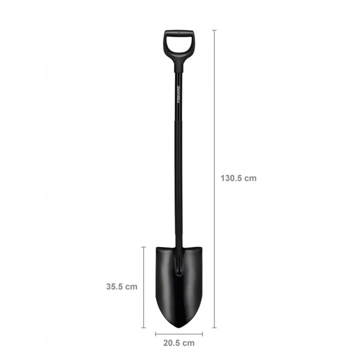 Професійна штикова лопата збільшеного розміру (XL) для важких робіт у щільному ґрунті, камінні та глині. Має загострене полотно зі сталевим підбором для втискання, платформу для ноги, міцний D-подібний хват, а також вигнуте антиковзке держално для кращої ергономіки та контролю.