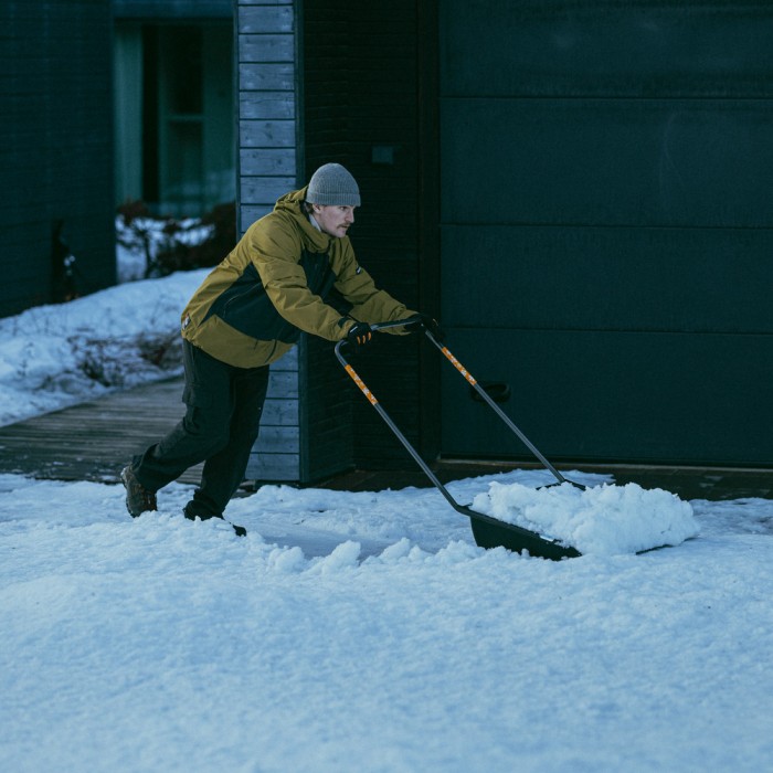 Fiskars SnowXpert 1003470: 74×149,5 см, ~4,3 кг — легша й маневреніша, але вужча смуга.