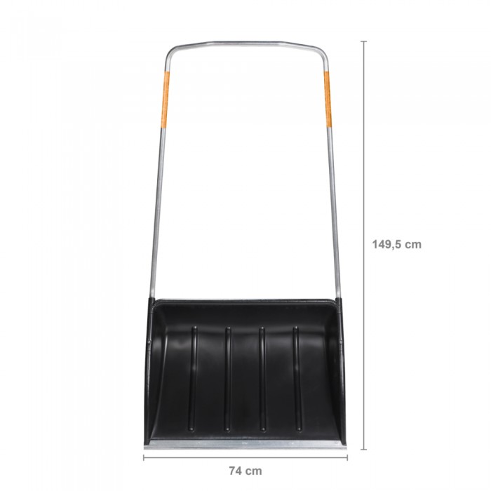 Професійна волокуша для швидкого прибирання великих площ. Робоча ширина 74 см, загальна довжина 149,5 см, вага ≈4,3 кг. Жорстка суцільна дуга-штовхач і металева кромка дають чистий прохід без піднімання снігу. Made in Finland.