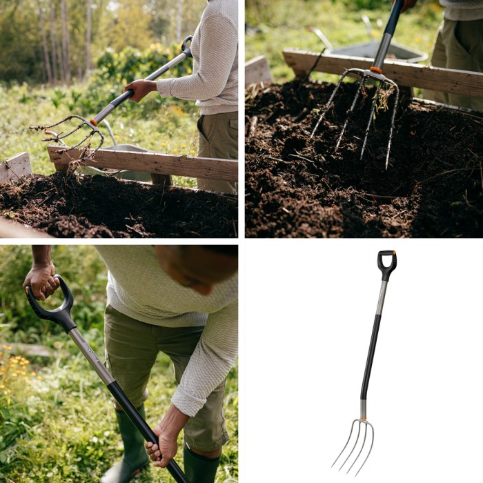 Прямых «вил для компоста» у Gardena нет; ближайшие — универсальные садовые вилы. Если нужна именно эргономика для компоста и лёгких объёмных материалов — преимущество за этой моделью Fiskars.